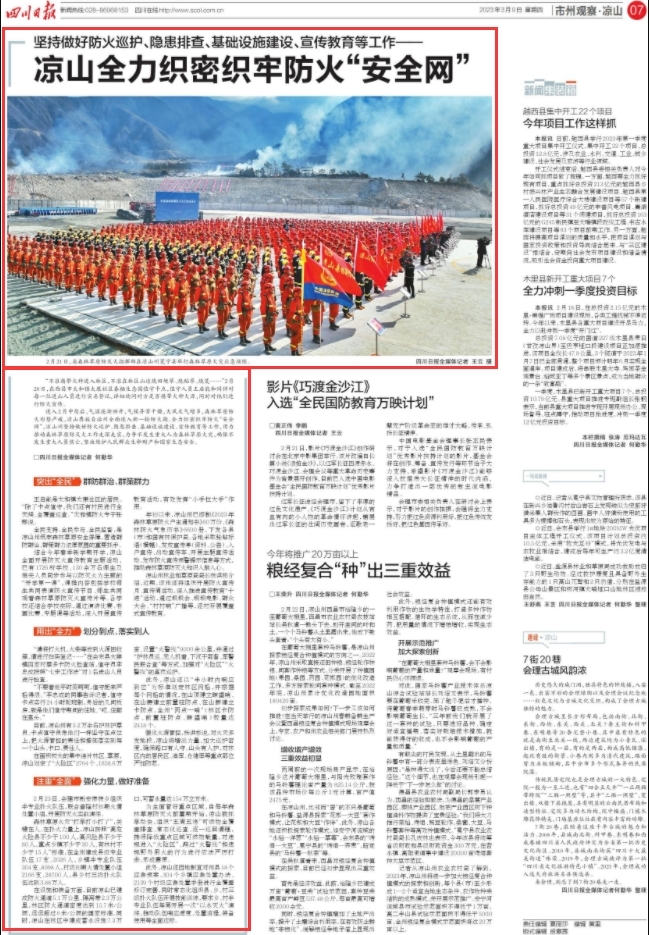 3月9日,《四川日报》刊发《凉山全力织密织牢防火“安全网”》文章,聚焦凉山坚持做好防火巡护、隐患排查、基础设施建设、宣传教育等工作,用力推动森林草原防灭火工作走深走实,力争不发生重大人为森林草原火灾,确保不发生重大人员伤亡,坚决维护人民群众生命财产和国家生态安全。