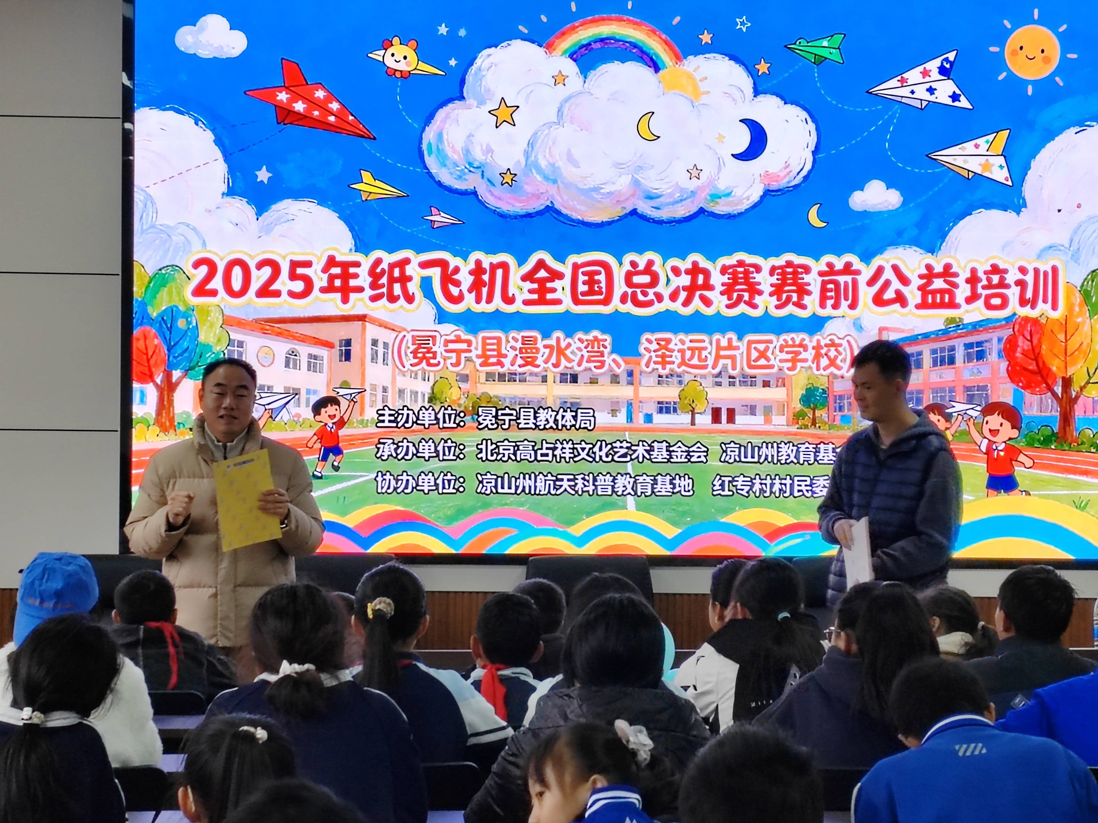 四川在线消息(周静) 近日,2025年全国纸飞机嘉年华暨“放飞梦想”全国青少年纸飞机通讯赛总决赛赛前公益培训,在位于冕宁县泽远镇红专村的凉山州航天科普教育基地举行,该片区近50名中小学教师及学生参加培训,一级裁判员、“放飞梦想”全国纸飞机总决赛副总裁判长纪宏毅领衔担任培训教师。