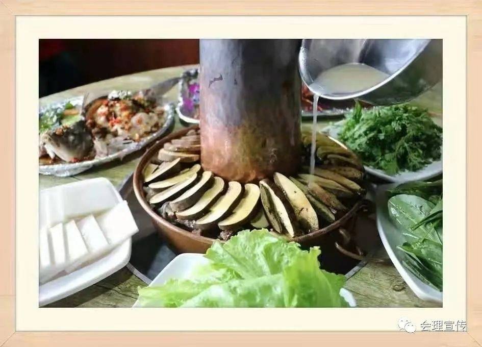 用会理的铜火锅,以火腿骨、鸡肉熬制的高汤为汤底,加入从大山里采摘的各种新鲜野生菌蘑、美味无比的鸡枞,与火腿、鸡肉同煮二十分钟,鲜美的山珍盛宴即成。