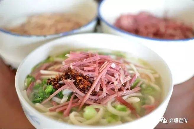 煮熟的饵块丝上,鸡肉撕成细丝,上好的精瘦火腿肉也切成细丝,掺入浓香的高汤。这道阳春白雪般的地道小吃,是会理美食的一道亮丽风景线,不容错过。