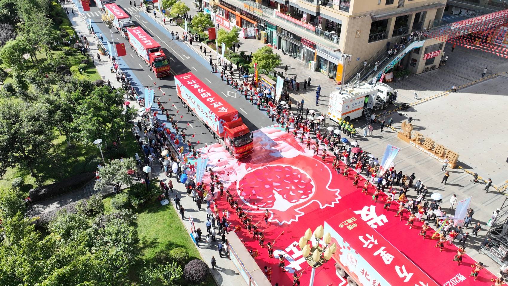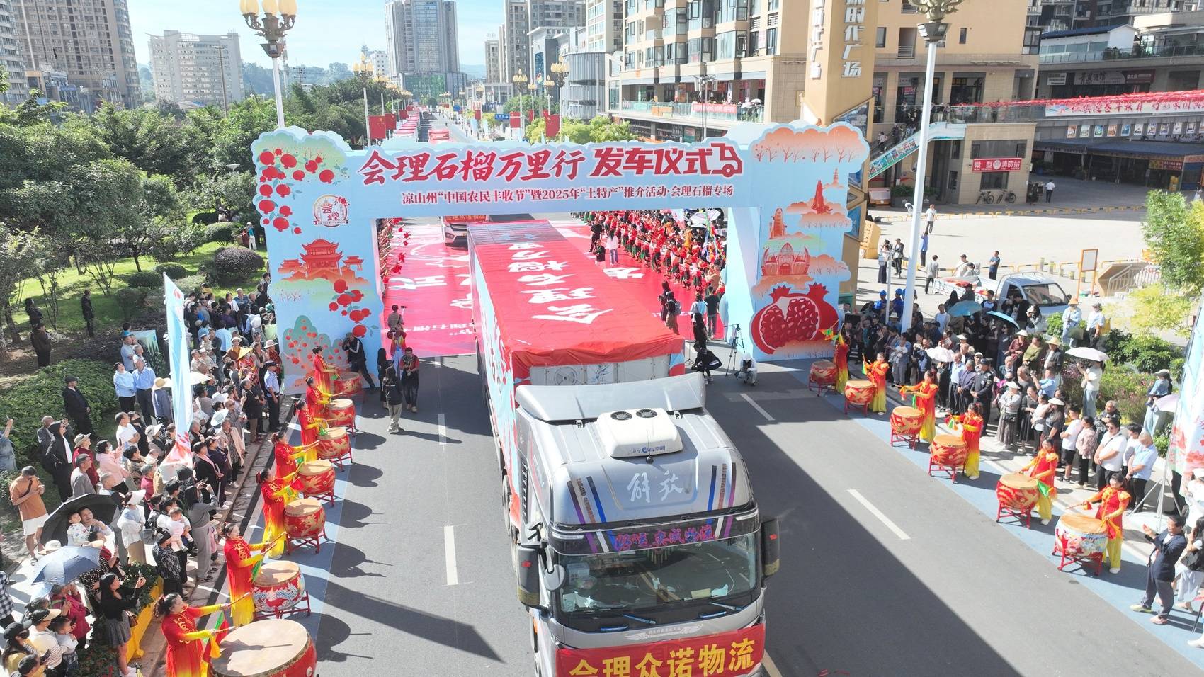 9月25日,凉山州“中国农民丰收节”暨2025年“土特产”推介活动·会理石榴专场在会理市瀛洲园举行。活动现场连线会理石榴发车仪式,100辆满载2500吨会理石榴、载着会理人民丰收喜悦的货车将驶向全国各地,为全国人民捎去会理金秋独有的甜蜜和祝福。