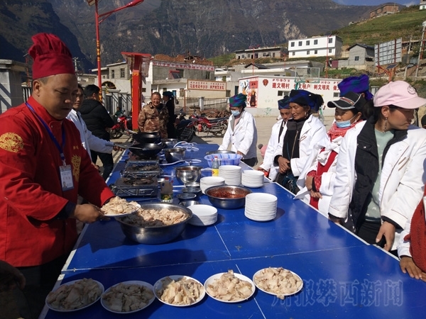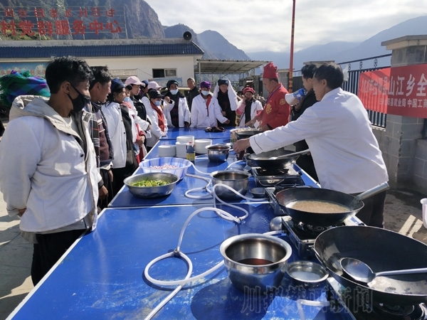 日前,在金阳县山江乡老寨子村党政服务中心前的坝子上,一位穿着红色的外套、红色帽的大厨在展示着自己的厨艺,另一位穿着工作服的青年用扩音小喇叭说教着,旁边一群身着白衣服、头戴厨师帽、围着统一的围裙的男女青年,围着厨师认真地看着、听着。