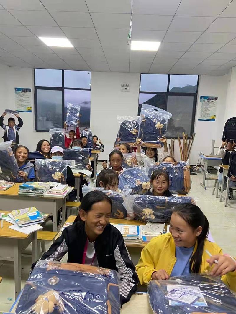 领到新书包,孩子们脸上溢满灿烂的笑容,同时更加坚定了以优异的成绩回报社会的决心。