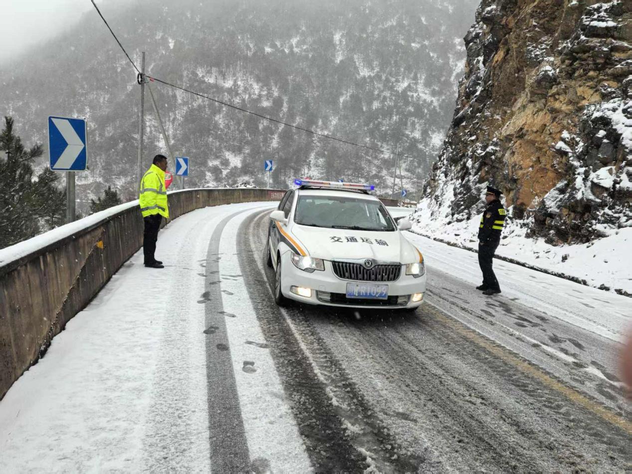 四川在线消息(文/图布呷)近日,随着气温骤降,木里县部分乡镇和高海拔地区出现降雪,加之建筑车辆的活动频率显著增多,给交通出行带来一定程度不便。根据县气象局发布的预警信息,木里县交通运输局与县公安交警大队迅速行动,立即安排人员在各点位进行疏导和劝导,全力以赴保障极端天气车流人流安全通行。