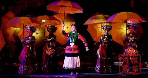 当晚,极具凉山彝族风情的演出“戏剧里的凉山”,在火秀中登场,在“远”“水”“伞”“火”“年”五个篇章中,祥和的彝族生活图景展现出上天入地的欢愉,而水火交融间金鹰腾空而起,预示新生的戏剧节振臂高飞。无数火把、火堆、火山与冲天的水柱、水帘、水幕,水乳交融、互相交织,火借水势、水助火威,凉山风情歌舞“火秀”以强烈的视觉冲击力和震撼的声响,直入天际、灿若星火,点亮西昌夜空。