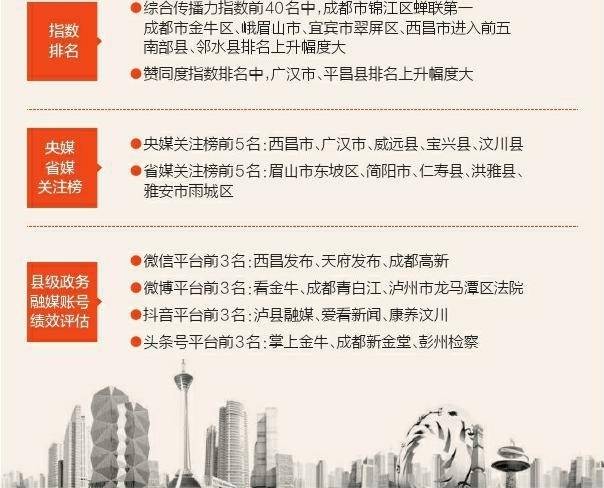 央媒关注榜中,西昌市、广汉市、威远县、宝兴县、汶川县名列最受央媒关注前5名。
