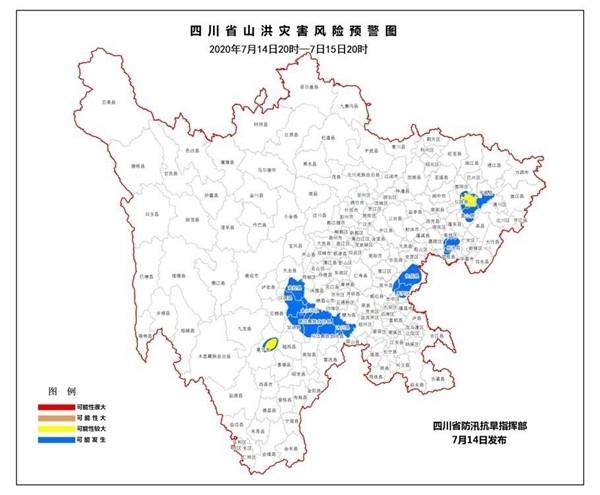 7月14日20时至15日20时,巴中市平昌县,南充市仪陇县、营山县,凉山州冕宁县等县(市、区)发生山洪灾害可能性较大;巴中市恩阳区、巴州区,南充市高坪县,广安市岳池县、武胜县,资阳市安岳县,内江市资中县、东兴区,雅安市荥经县、汉源县,乐山市金河口区、沐川县、峨边县、马边县,凉山州甘洛县等县(市、区)可能发生山洪灾害。