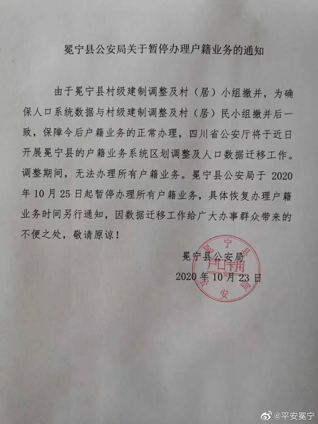 近日,冕宁县公安局发布暂停办理户籍业务的通知。据悉,由于冕宁县村级建制调整及村(居)小组撤并,为确保人口系统数据与村级建制调整及村(居)民小组撤并后一致,保障今后户籍业务的正常办理,四川省公安厅将于近日开展冕宁县的户籍业务系统区划调整及人口数据迁移工作。调整期间,无法办理所有户籍业务。冕宁县公安局于2020年10月25日起暂停办理所有户籍业务,具体恢复办理户籍业务时间另行通知。