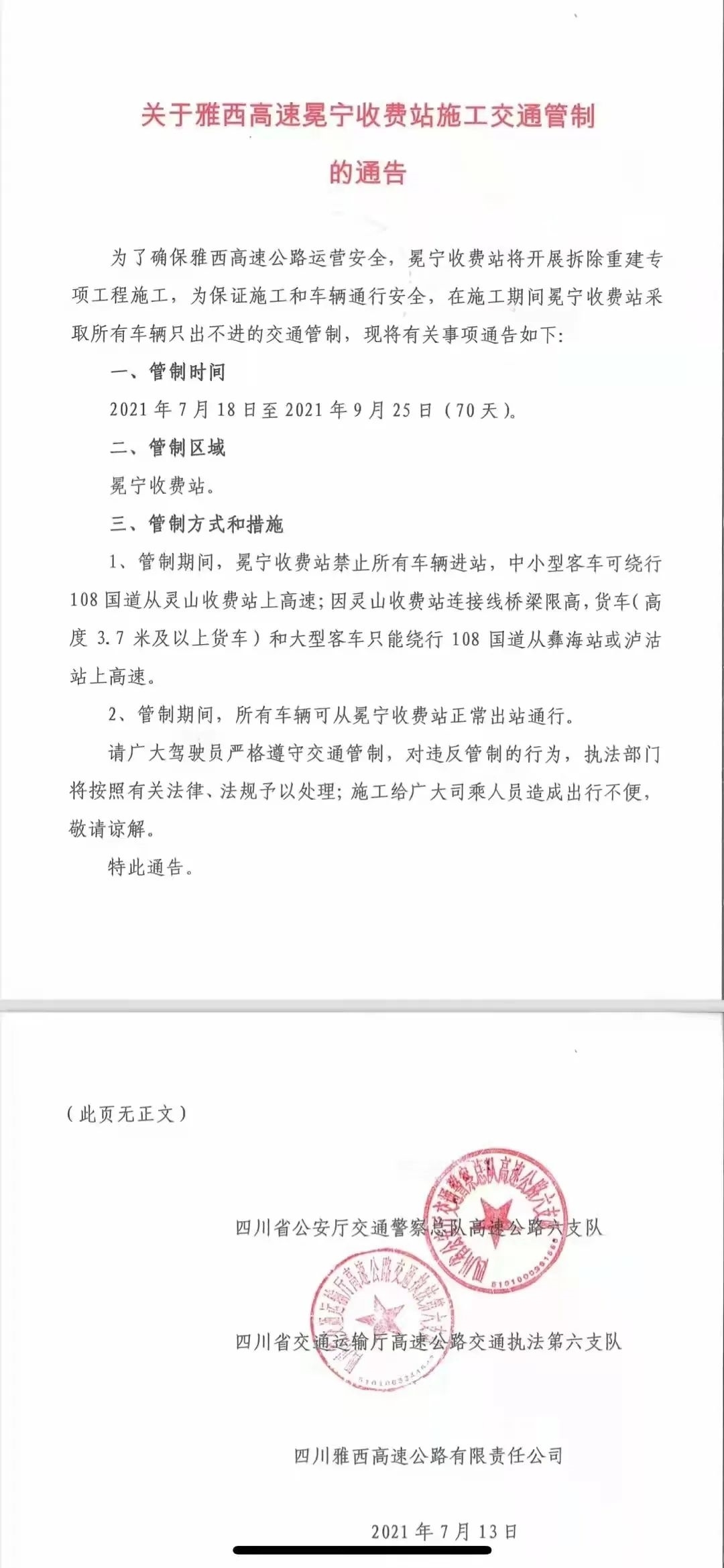 管制期间,冕宁收费站禁止所有车辆进站,中小型客车可绕行108国道从灵山收费站上高速;货车(高度3.7米及以上货车)和大型客车只能绕行108国道从彝海站或泸沽站上高速。