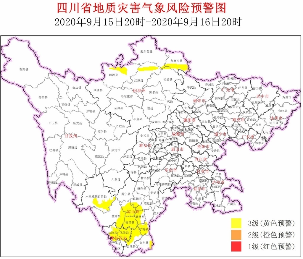 9月15日,四川省地质灾害指挥部办公室发布全省地质灾害气象风险预警,结合四川省气象台天气预报情况,9月15日20时~9月16日20时,攀枝花、阿坝、凉山三市州共有19个县(市、区)进入黄色预警范围,相比前一天,地灾预警范围从攀西地区扩大到盆地北部山区。