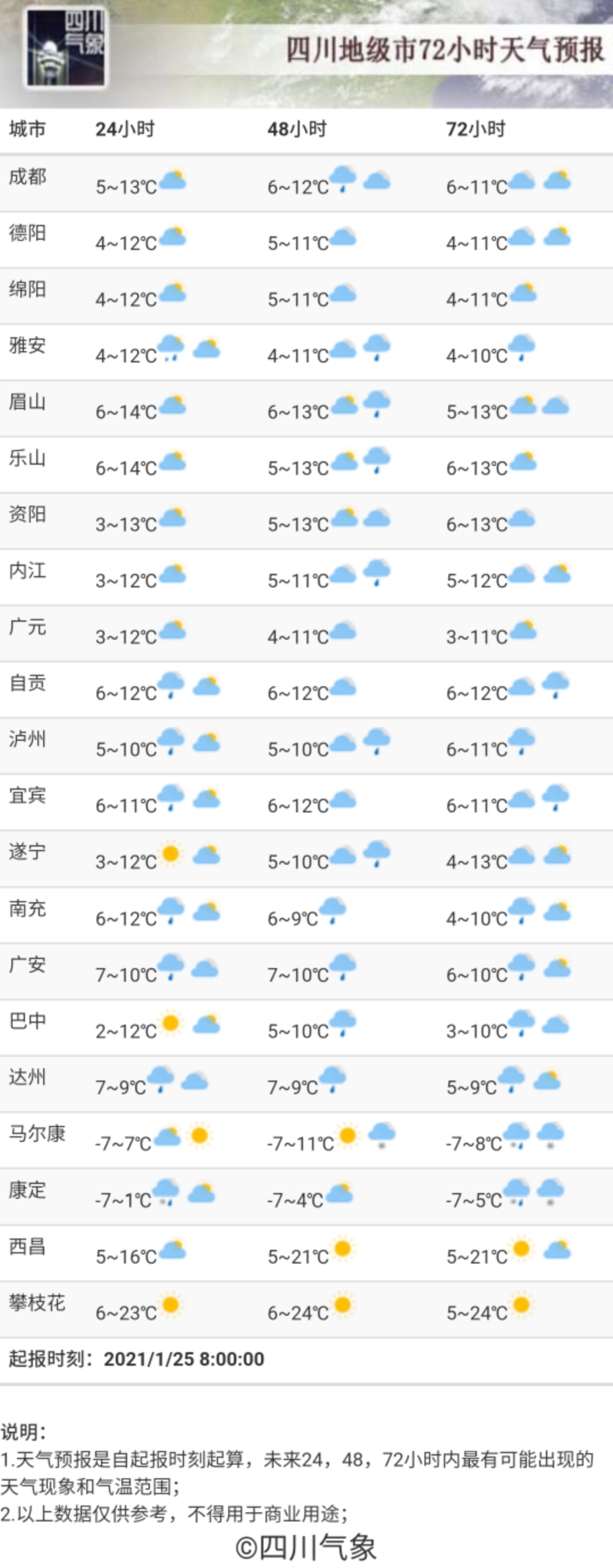 四川省气象台今天(1月25日)早间天气预报显示: