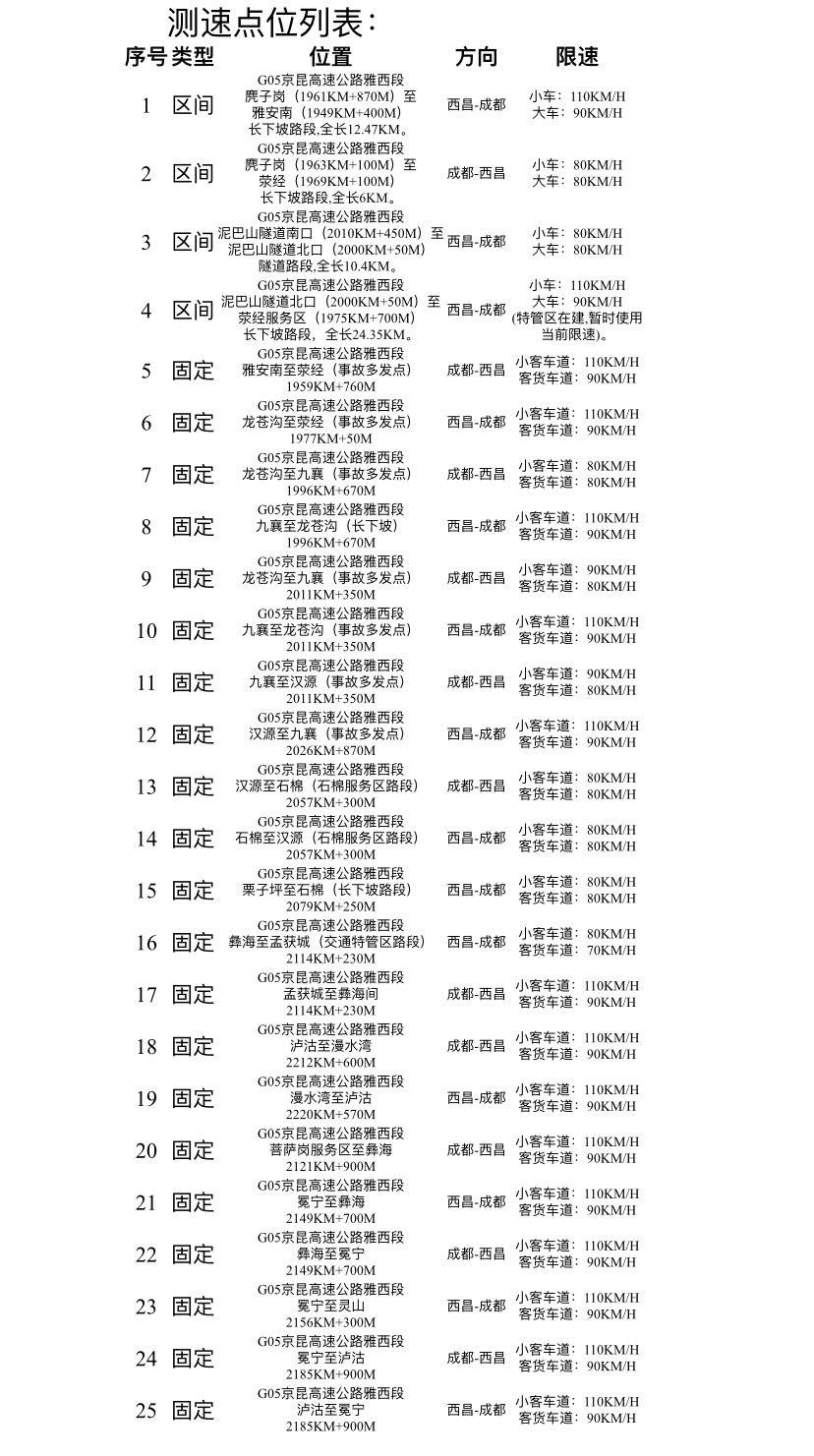 1月26日,记者从四川省公安厅高速公路公安局六分局获悉,该局分别在G05京昆高速雅西段25个点位设置测速设备,并将于2021年2月3日正式启用。快来看看具体测速点位: