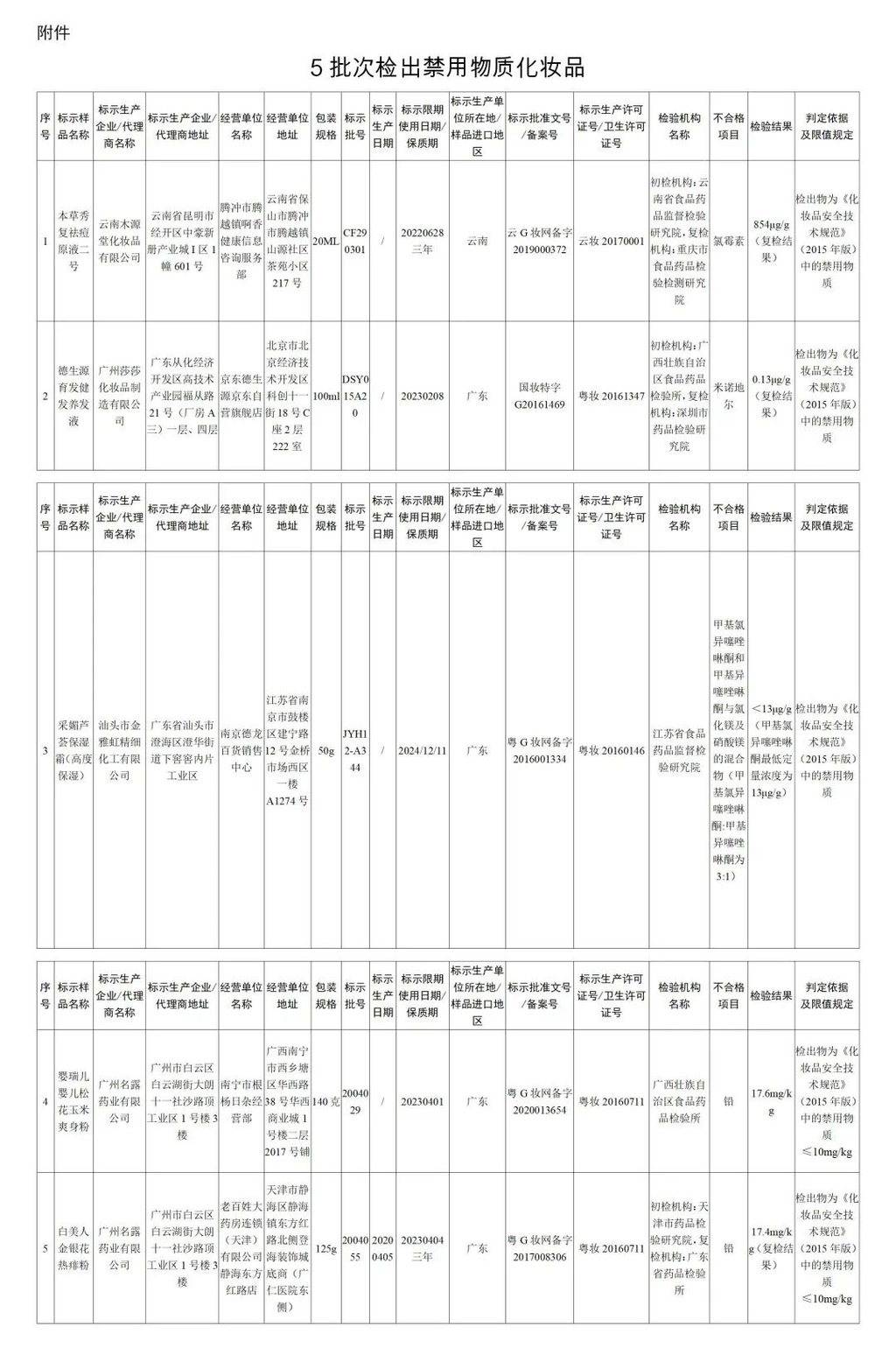 2月1日,记者从四川省药监局获悉,在2020年国家化妆品监督抽检工作中,经云南省食品药品监督检验研究院等单位检验,5批次化妆品检出禁用物质。