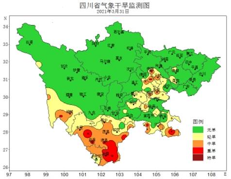 根据气象部门监测,3月四川全省平均气温偏高2.1℃,排历史同期第5高位。截至3月31日,全省有53站(盆地30站)出现干旱,其中重旱13站(盆地6站)、特旱10站(盆地5站)。中度以上旱情主要分布在盆中、盆南、攀西大部和甘孜州南部。