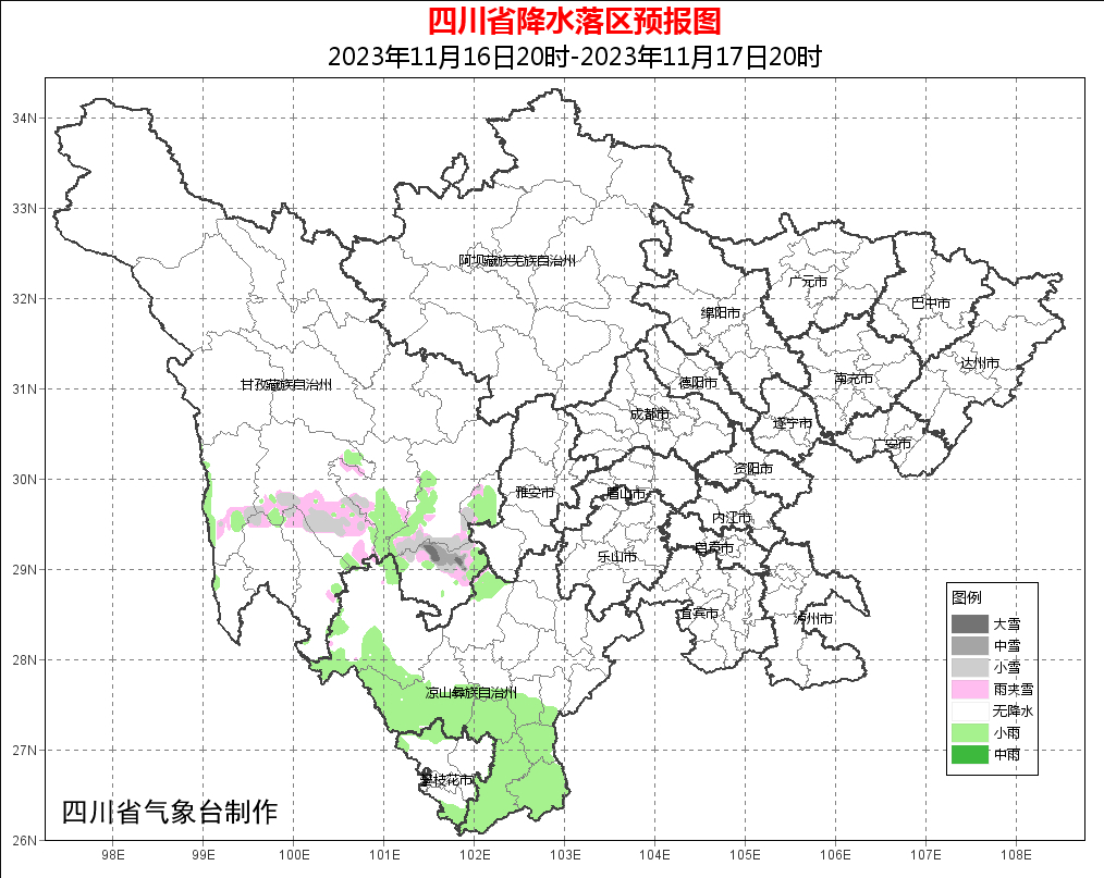 11月16日晚上到17日白天,除甘孜州南部、攀西地区西部多云间阴有分散阵雨(雪)外,全省大部多云间晴。