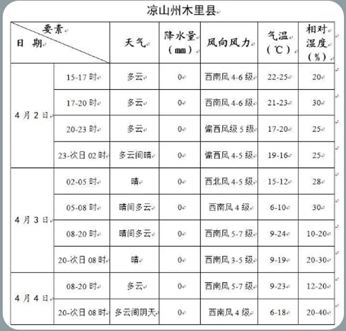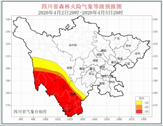 根据最新气象资料分析,四川省气象台预计:2020年4月3~4月5日,甘孜州西南部和攀西地区大部以多云间晴的天气为主,湿度小空气干燥、风力大,森林火险气象等级可达4~5级。