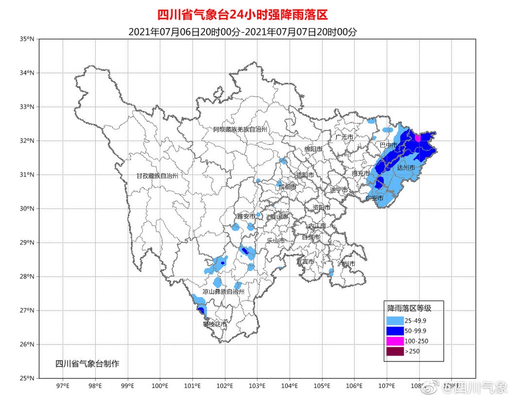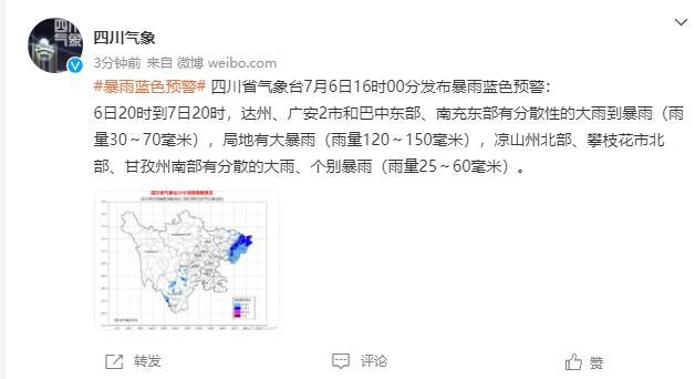 四川省气象台7月6日16时00分发布暴雨蓝色预警:6日20时到7日20时,达州、广安2市和巴中东部、南充东部有分散性的大雨到暴雨(雨量30~70毫米),局地有大暴雨(雨量120~150毫米),凉山州北部、攀枝花市北部、甘孜州南部有分散的大雨、个别暴雨(雨量25~60毫米)。