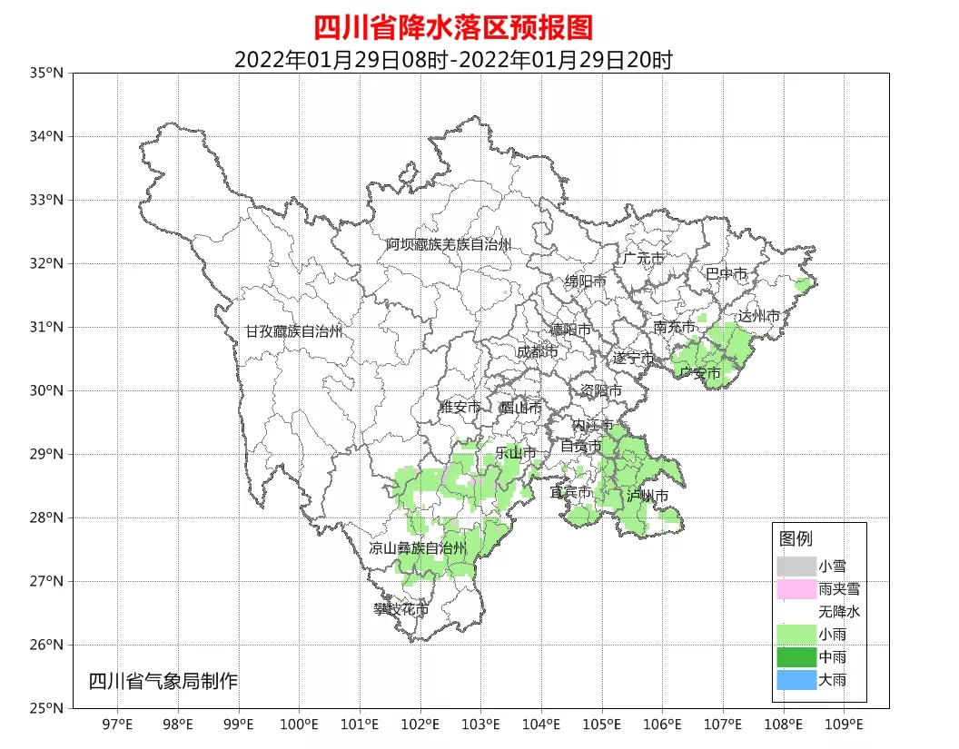 29日白天,达州、广安、宜宾、泸州多云间阴天,早晚有小雨,盆地其余地方多云,平坝河谷早晨有雾,北部早晨有霜;川西高原多云间晴;攀西地区西部多云间晴,其余地方阵雨(雪)转多云。