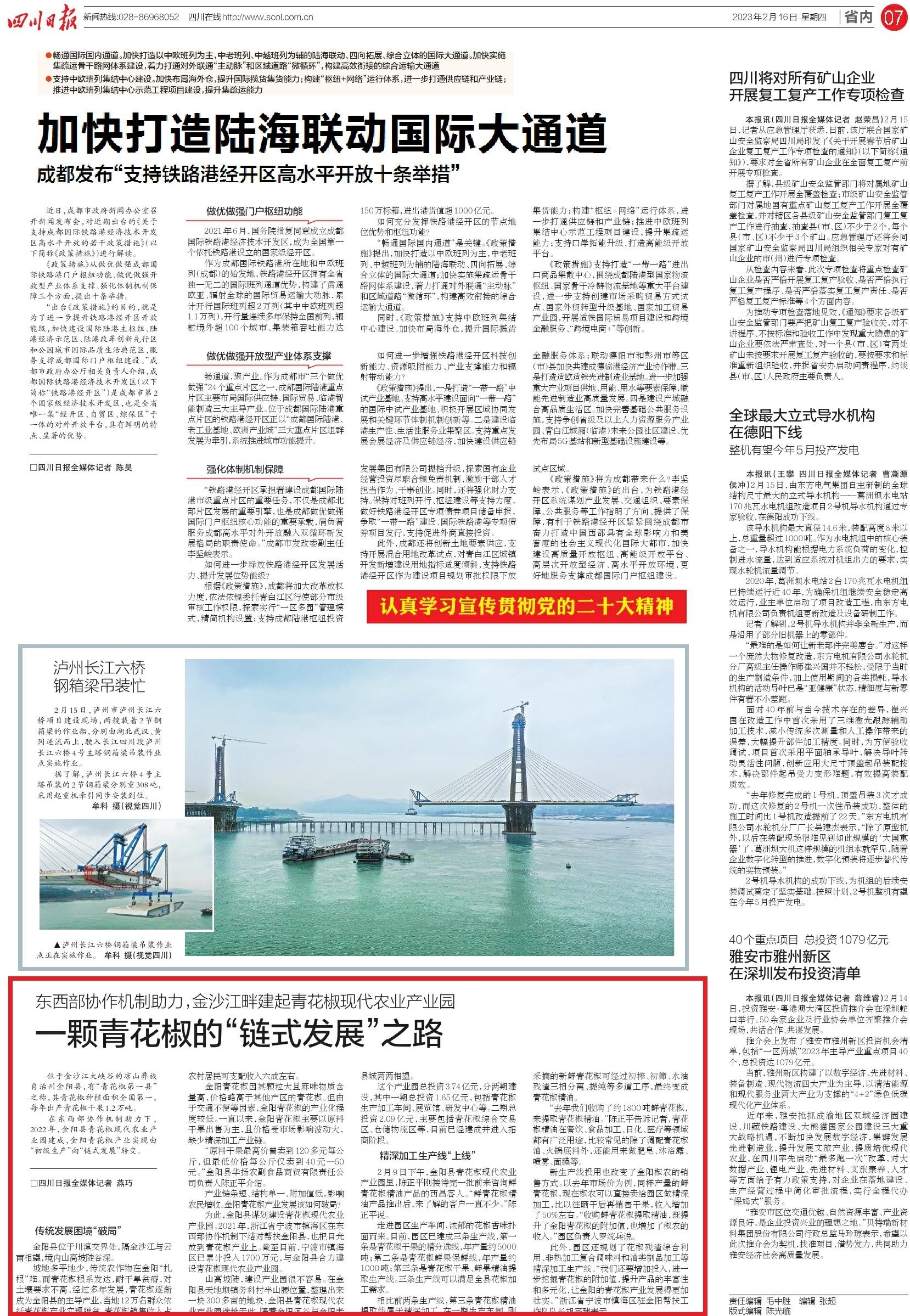 2月16日,四川日报7版刊发稿件《东西部协作机制助力,金沙江畔建起青花椒现代农业产业园一颗青花椒的“链式发展”之路》,聚焦金阳县在东西部协作机制助力下建成青花椒现代农业产业园,金阳青花椒产业实现由“初级生产”向“链式发展”转变。