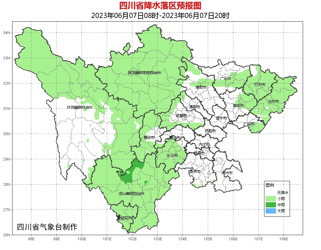 今天白天:广元、巴中、达州、雅安、乐山5市和南充、广安2市东部及绵阳西部阵雨或雷雨转多云,盆地其余地方多云间晴;甘孜州西南部多云间晴,川西高原其余地方和攀西地区阴天间多云有阵雨或雷雨,其中凉山州北部的局部地方有中雨。