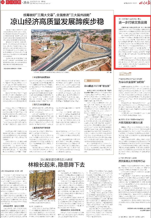 2月8日,四川日报刊发文章《凉山文旅推介走进沈阳、重庆进一步打响文旅品牌》,聚焦2024年游五彩凉山·品美味烧烤凉山文旅推介会暨沈阳至西昌航线开通仪式在辽宁省沈阳市举行,凉山文旅宣传推介会在重庆市举行。