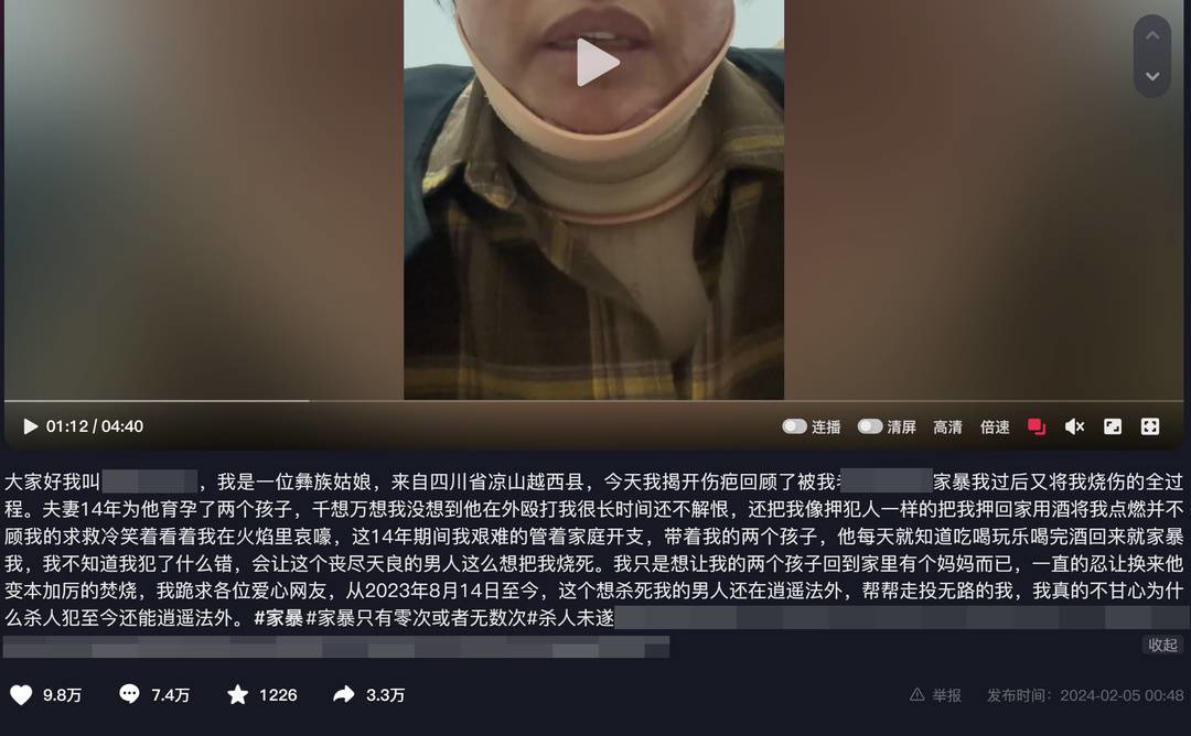 今年2月,凉山州越西县女子曲某在社交平台上发视频称,她被丈夫木某长期家暴,2023年8月,木某将酒泼在她的身上并点燃,导致其身体被大面积烧伤,众多网友对此表示强烈愤慨。
