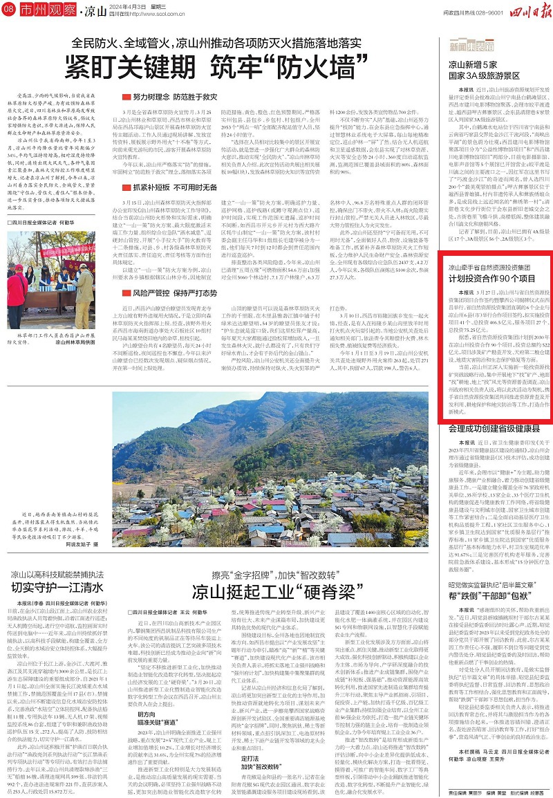 4月3日,《四川日报》刊发《凉山牵手省自然资源投资集团 计划投资合作90个项目》文章,聚焦省自然资源投资集团计划到2030年在凉山州投资合作90个项目,投资总额约522亿元,项目涉及矿产勘查开发、天府第二粮仓建设、地质灾害防治和生态保护修复等方面。