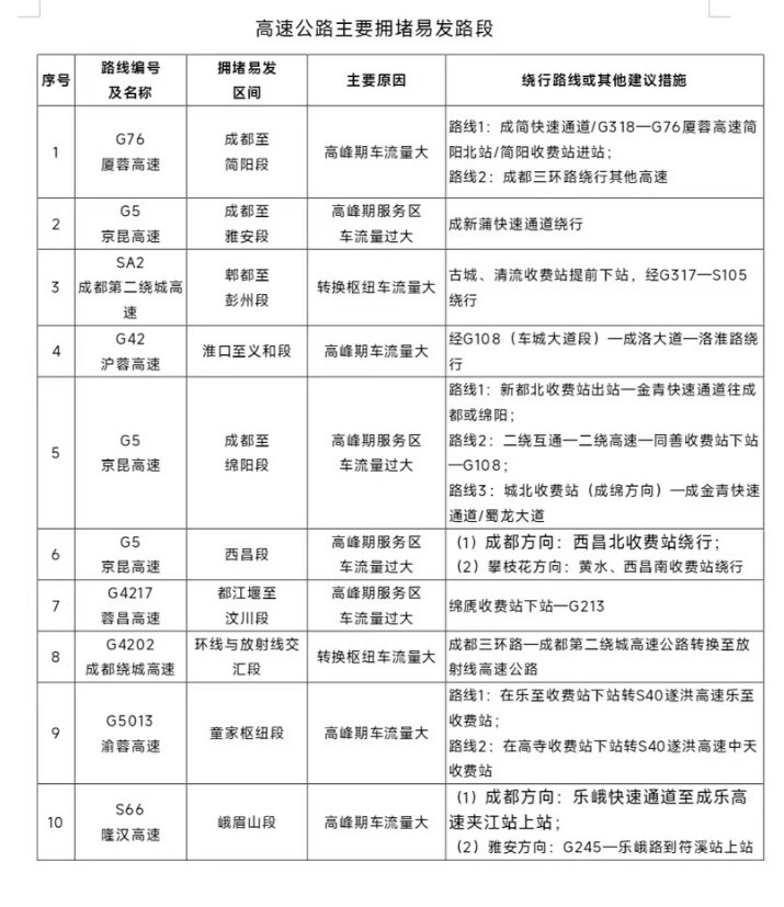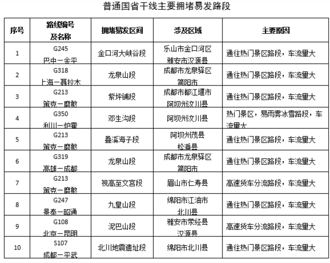 另外,四川公安交警还发布了10段高速公路主要拥堵易发路段,10段普通国省干线主要拥堵易发路段;3段高速公路影响通行的施工及管制路段,15段普通国省干线影响通行的施工及管制路段。
