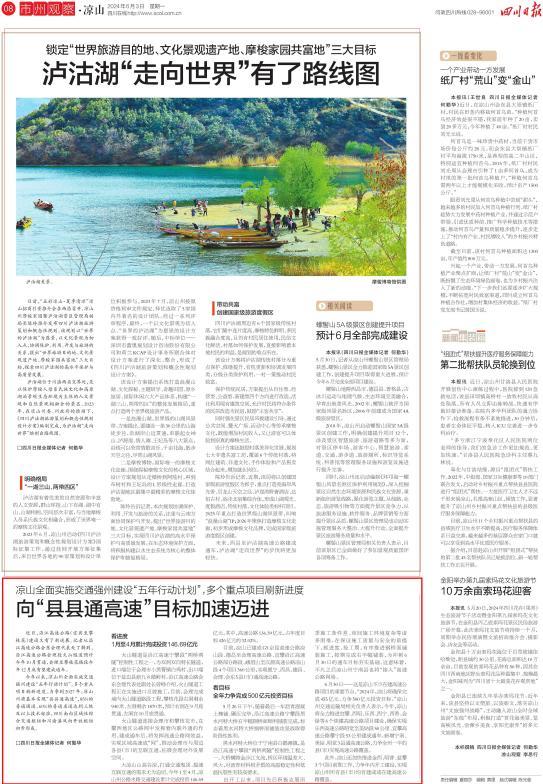 6月3日,《四川日报》刊发《凉山全面实施交通强州建设“五年行动计划”》文章,关注凉山州全面实施交通强州建设“五年行动计划”,目前,多个重点项目刷新进度,力争到2027年,凉山州将基本实现“县县通高速”,85%的普通国道、60%的普通省道达到三级及以上技术标准,四川南向区域性综合交通枢纽和川渝滇双向开放枢纽初步形成。
