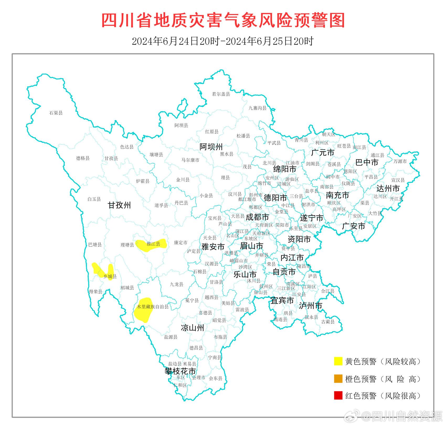 甘孜、凉山5个县地质灾害风险较高,请注意防范!根据四川省气象台天气预报情况,结合四川省地质环境条件,6月24日20时至6月25日20时,全省地质灾害气象风险预警结果如下: