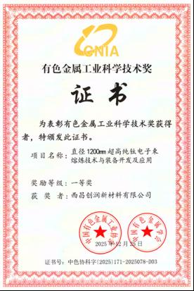 四川在线消息(文/图 杨恒)近日,从凉山高新技术产业园区获悉,西昌创润新材料有限公司凭借“直径1200mm超高纯钛电子束熔炼技术与装备开发及应用”项目,荣获中国有色金属工业协会、中国有色金属学会联合颁发的“有色金属工业科学技术奖一等奖”,标志着在高纯钛材料制备领域取得重大技术突破。