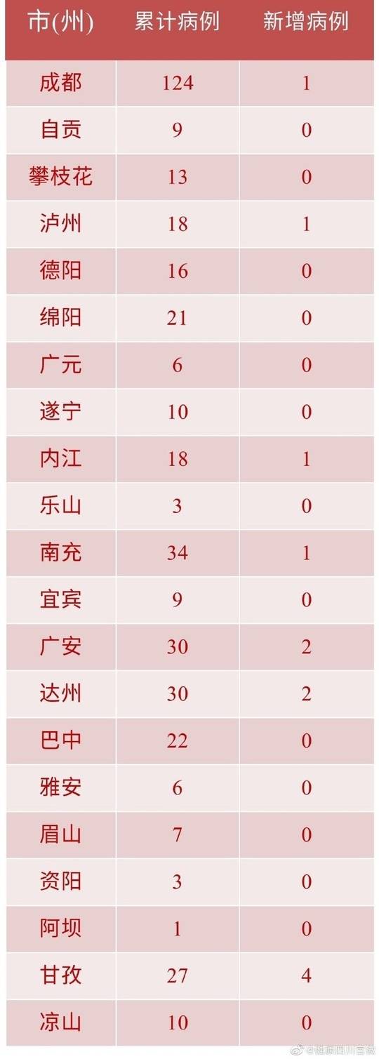 新增确诊病例中,甘孜州4例、广安市2例、达州市2例、成都市1例、泸州市1例、内江市1例、南充市1例。