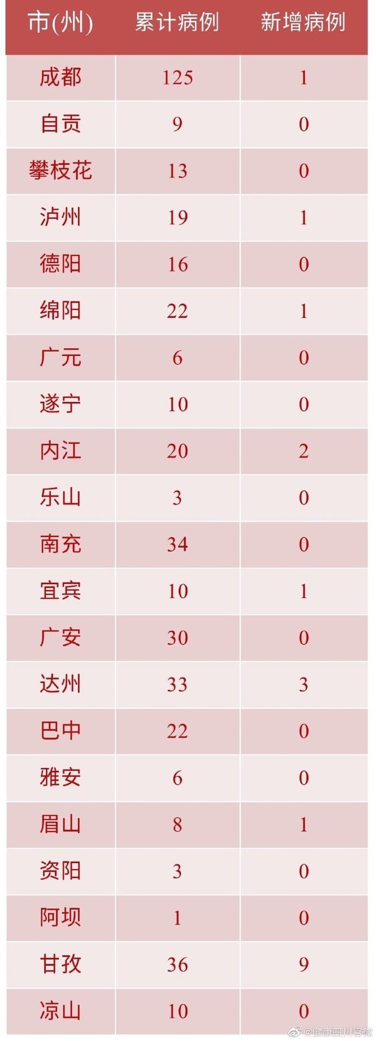 新增确诊病例中,甘孜州9例、达州市3例、内江市2例、成都市1例、泸州市1例、绵阳市1例、眉山市1例、宜宾市1例。