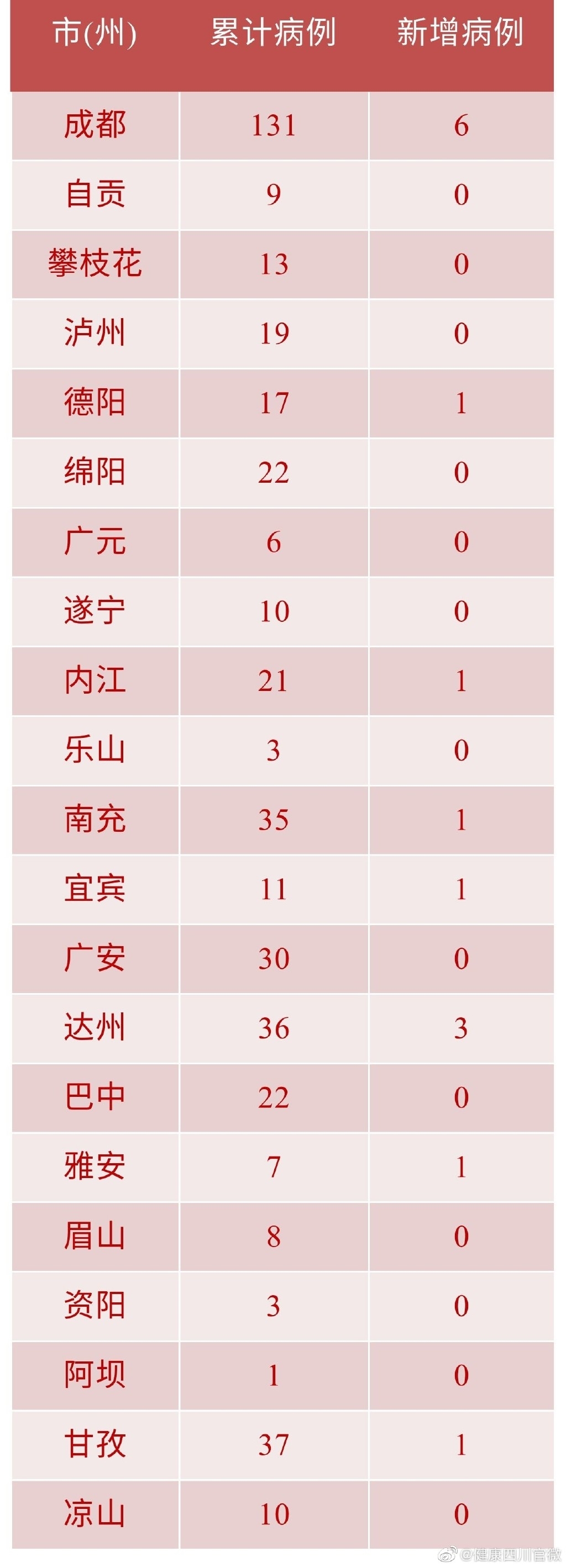 新增治愈出院病例中,遂宁市2例、广安市2例、成都市1例、内江市1例、南充市1例、甘孜州1例。