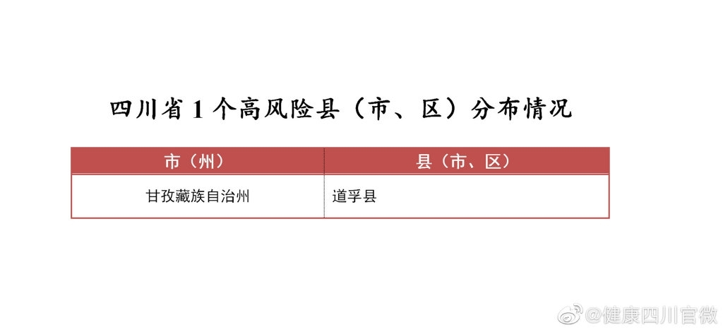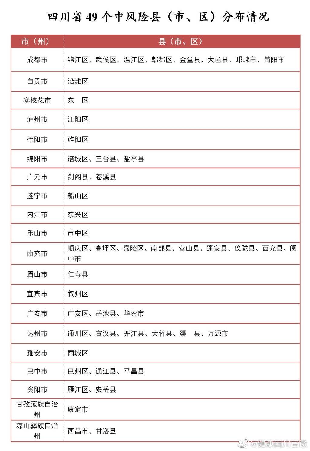 全省现有无现症病例区(低风险县<市、区>)133个、散发病例区(中风险县<市、区>)49个、社区暴发和局部流行区(高风险县<市、区>)1个(过去24小时新增新都区、龙马潭区、泸县、武胜县为低风险县<市、区>)。