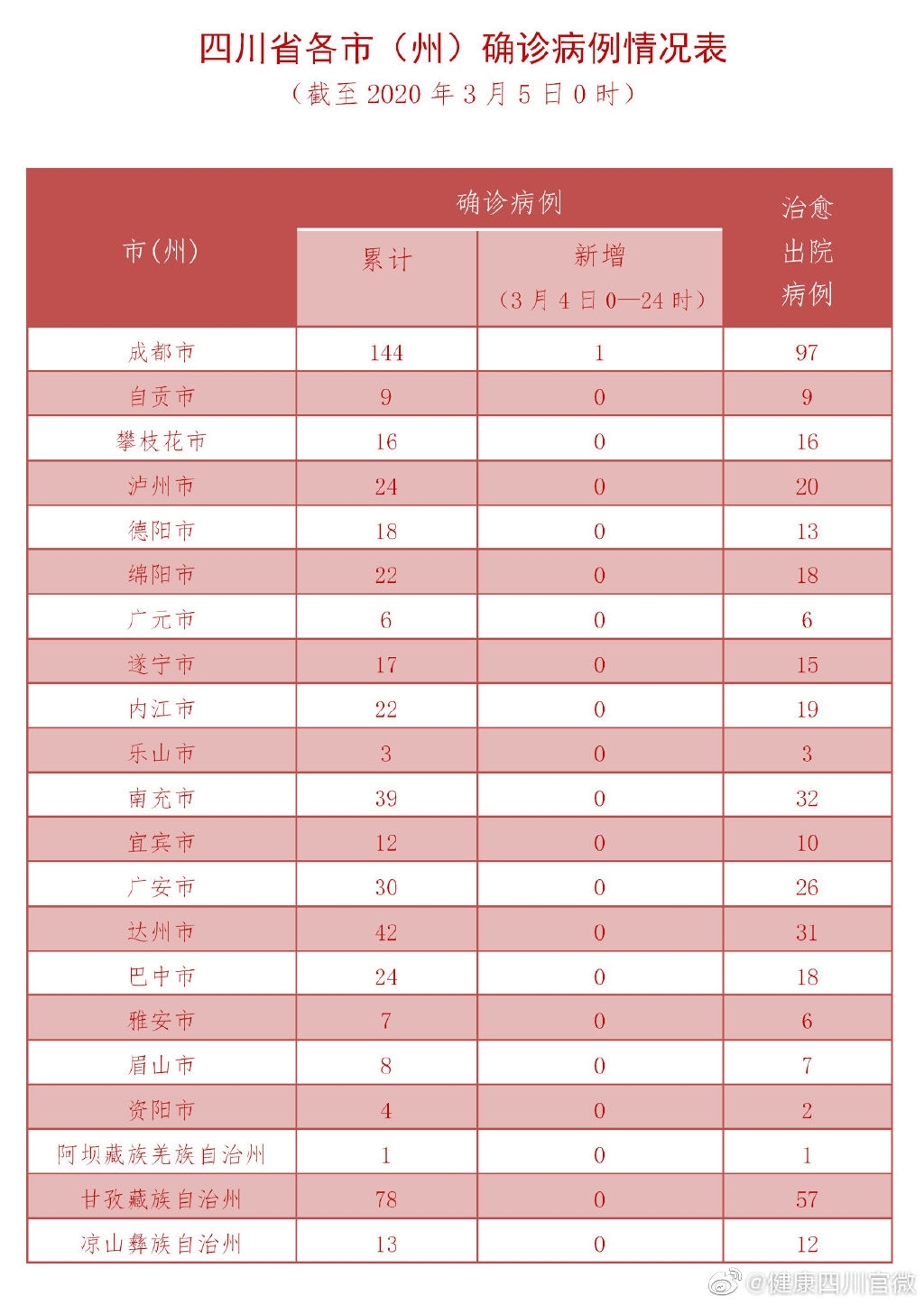 截至3月5日0时,四川省累计报告新型冠状病毒肺炎确诊病例539例,涉及21个市(州)。