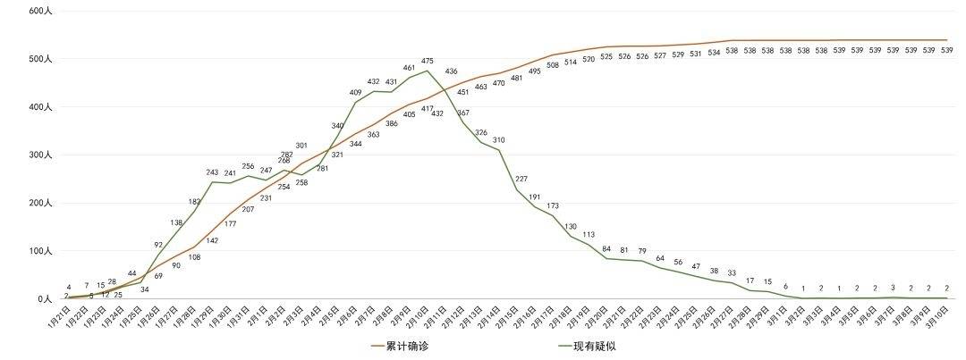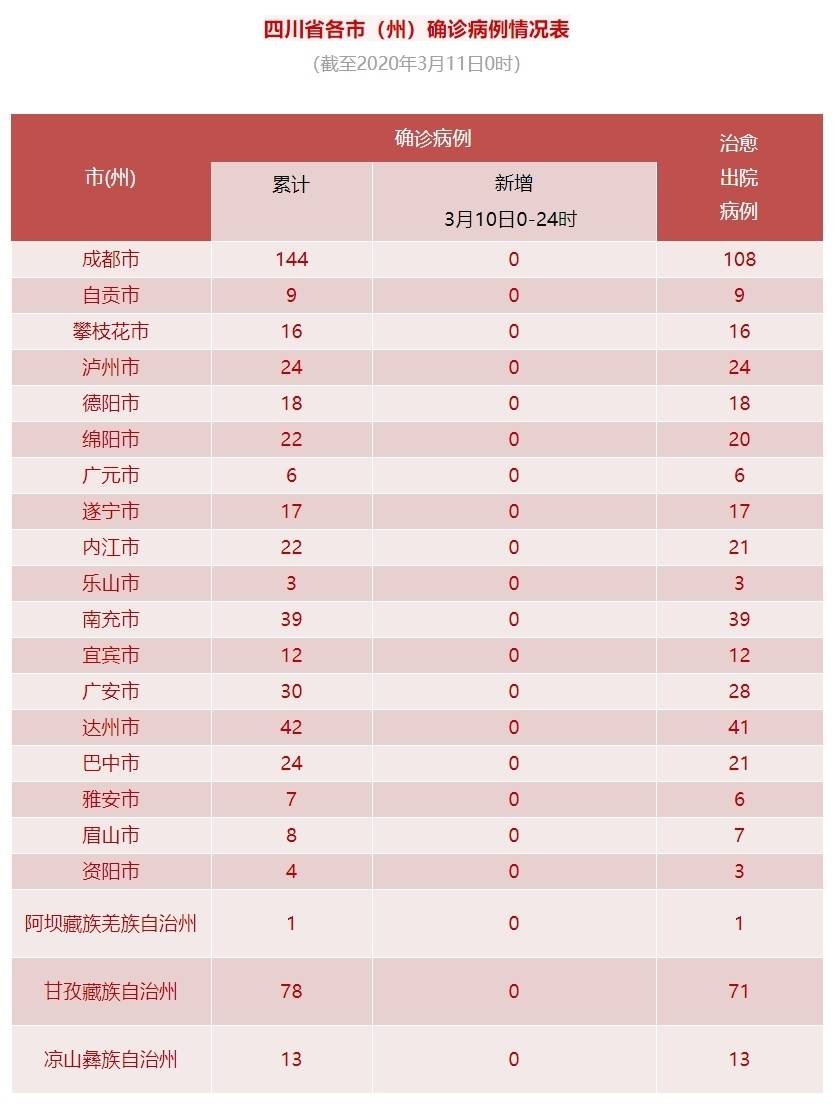 截至3月11日0时,四川省累计报告新型冠状病毒肺炎确诊病例539例,涉及21个市(州)。