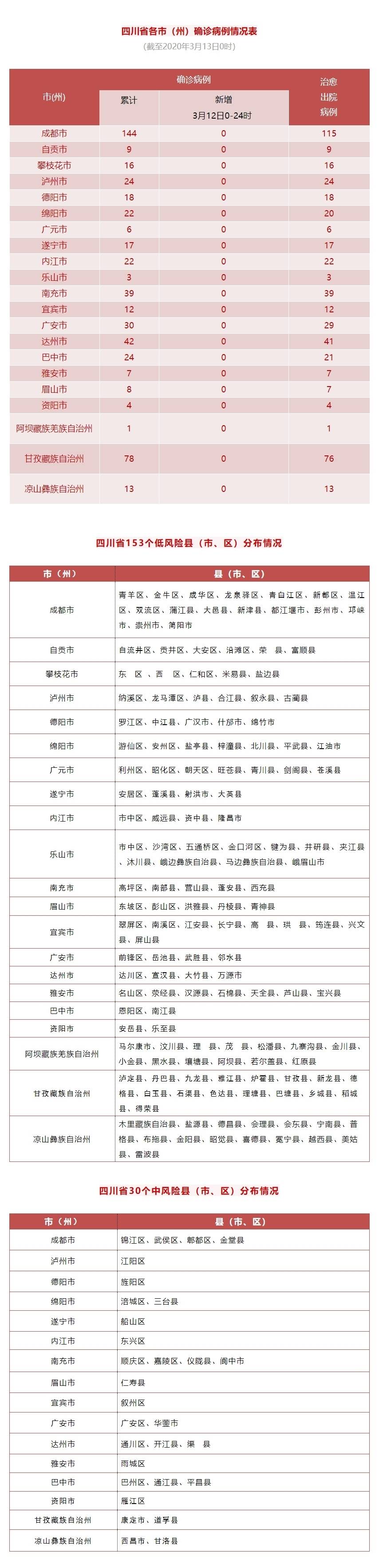 全省现有无现症病例区(低风险县<市、区>)153个、散发病例区(中风险县<市、区>)30个,无社区暴发和局部流行区(高风险县<市、区>)。(过去24小时新增沿滩区、万源市为低风险县<市、区>)。