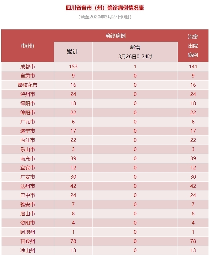 四川在线消息(记者 石小宏 殷鹏) 3月26日0-24时,四川省新型冠状病毒肺炎新增确诊病例1例(境外输入),无新增治愈出院病例,无新增疑似病例,无新增死亡病例。