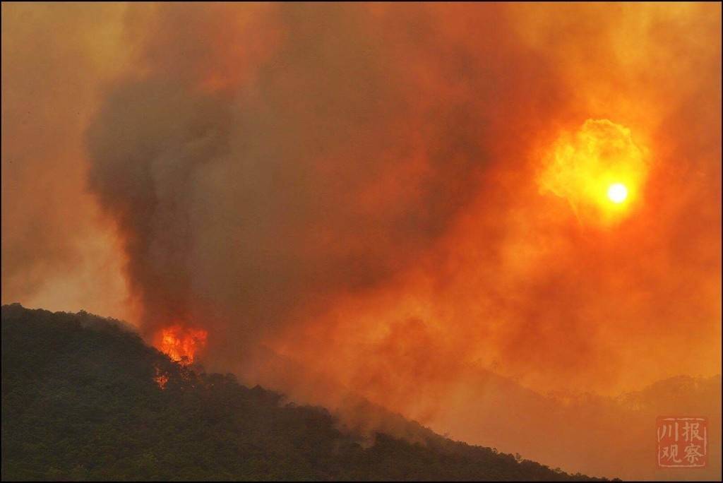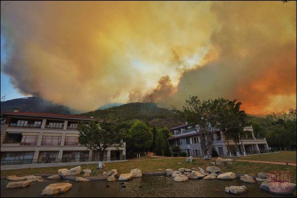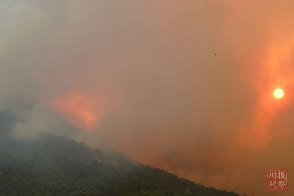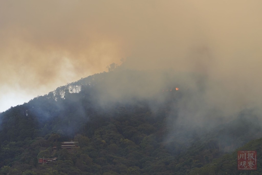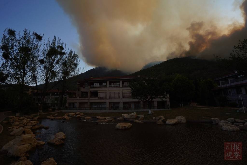 记者在邛海宾馆拍摄点,距离燃火点800米,可以感到炽热的辐射,著名的古刹光福寺也笼罩在浓烟中。