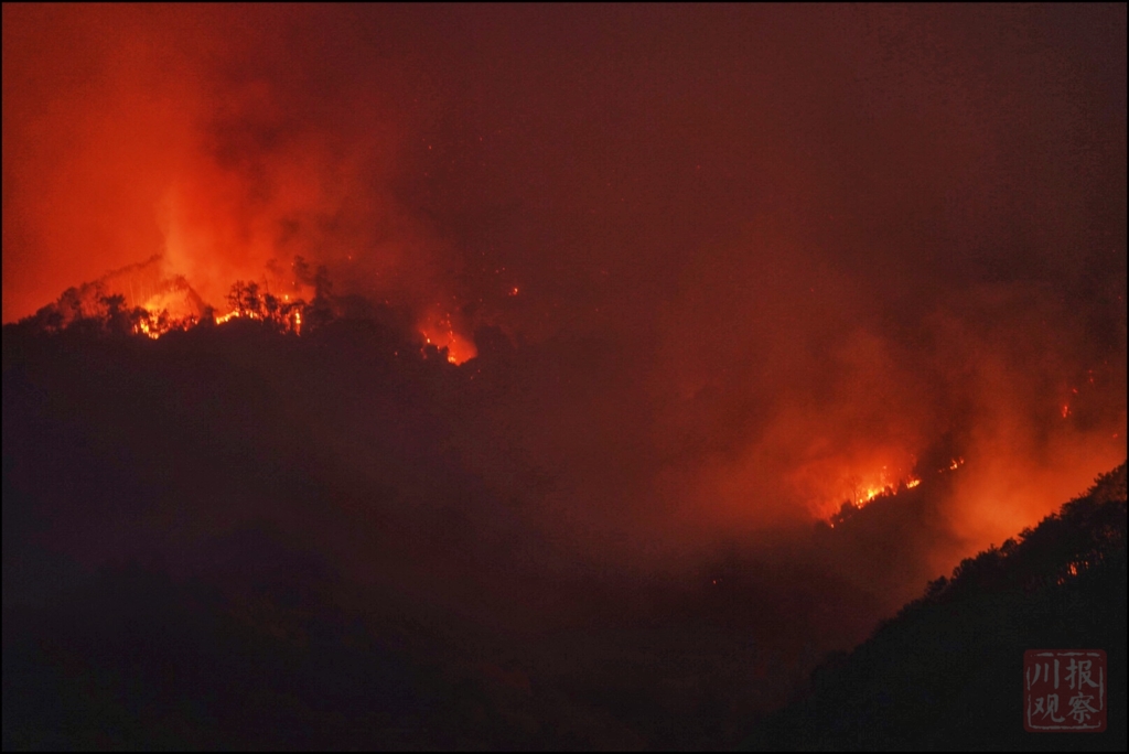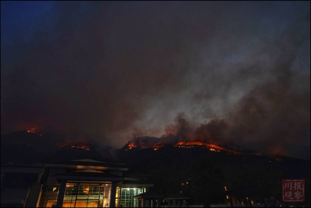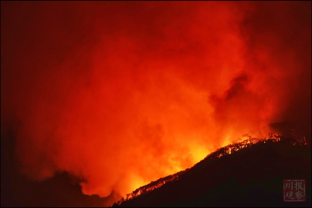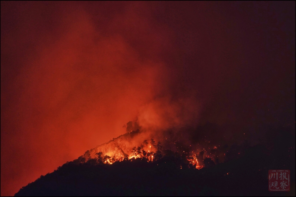 晚8时许,西昌市森林火灾火势借风力增大,泸山景区方向火光冲天,浓烟遮盖夜色和星空。