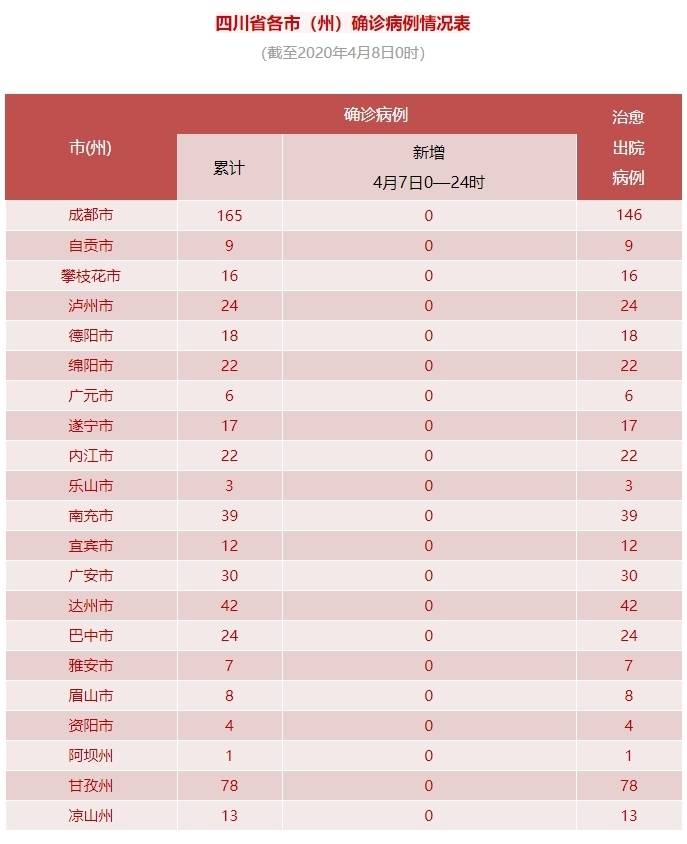 四川在线消息(记者 石小宏 殷鹏)4月8日,据四川省卫健委消息:4月7日0-24时,四川省新型冠状病毒肺炎无新增确诊病例,无新增治愈出院病例,无新增疑似病例,无新增死亡病例。