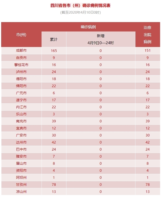 四川在线消息(记者 石小宏 殷鹏)4月10日,据四川省卫健委消息:4月9日0-24时,四川省新型冠状病毒肺炎无新增确诊病例,新增治愈出院病例5例,无新增疑似病例,无新增死亡病例。