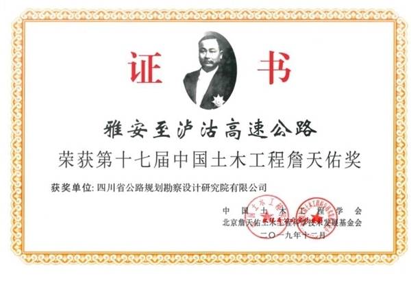 第17届中国土木工程詹天佑奖共有31个工程项目获奖,其中,公路工程两项,雅安至泸沽高速公路夺得一席。