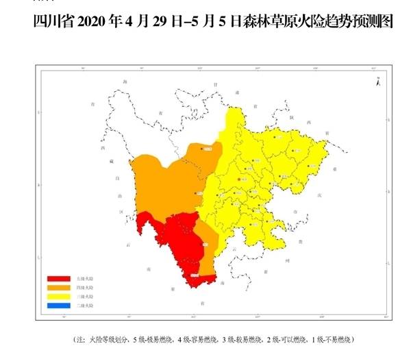 4月29日,省森林草原防灭火指挥部办公室发布了高森林草原火险橙色预警。阿坝州西南部、甘孜州中南部、凉山州西南部、攀枝花市森林草原火险等级可达4级以上,盐源、得荣、木里、九龙等局部县(市)可达5级,需要严防。