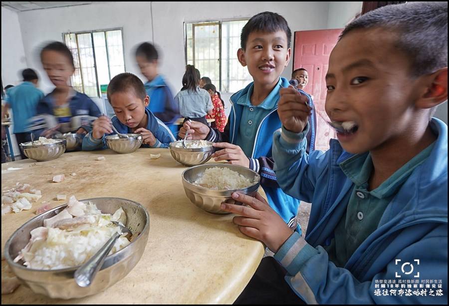 ●阿布洛哈村小学的学生正在学校餐厅吃有肉有菜的营养午餐。拍摄于2020年6月20日