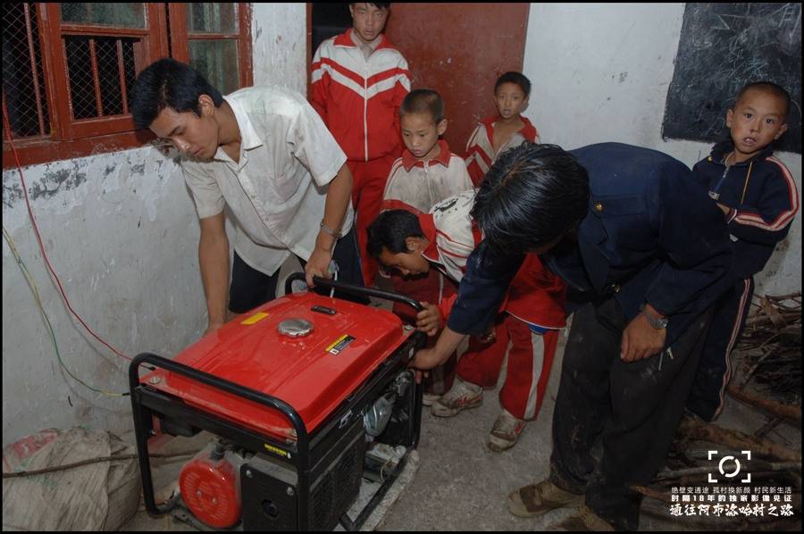 ●阿布洛哈村村民吉力史日正在发动村里唯一一台柴油发电机,小学由于缺电晚上全靠这台设备发电。拍摄于2007年7月12日