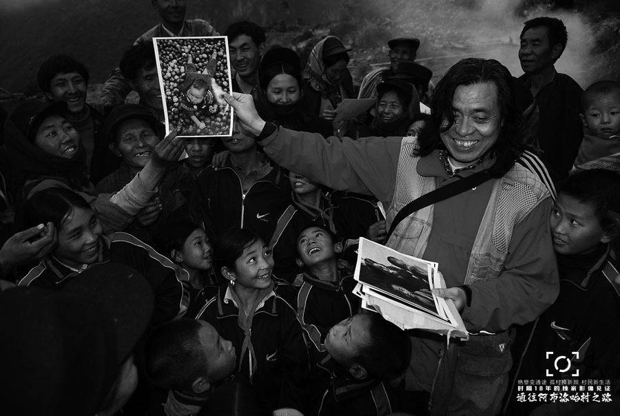 ●四川著名摄影师林强将他拍摄的照片分发给阿布洛哈村的村民。摄于2007年7月