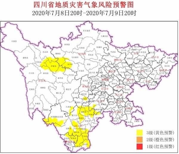 7月8日,省地质灾害指挥部办公室发布全省地质灾害气象风险预警,结合四川省气象台天气预报情况,7月8日20时~7月9日20时,攀枝花、乐山、雅安、阿坝、甘孜、凉山等地部分地区为3级(黄色预警)。