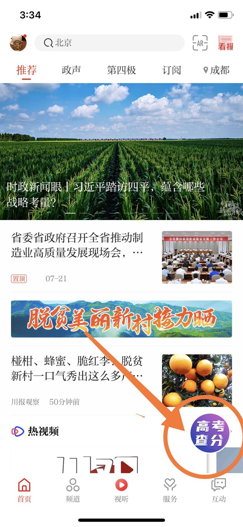 进入川报观察客户端首页 → 点击右下角“高考查分”悬浮球 → 进入查分页面 →根据提示进行查分。